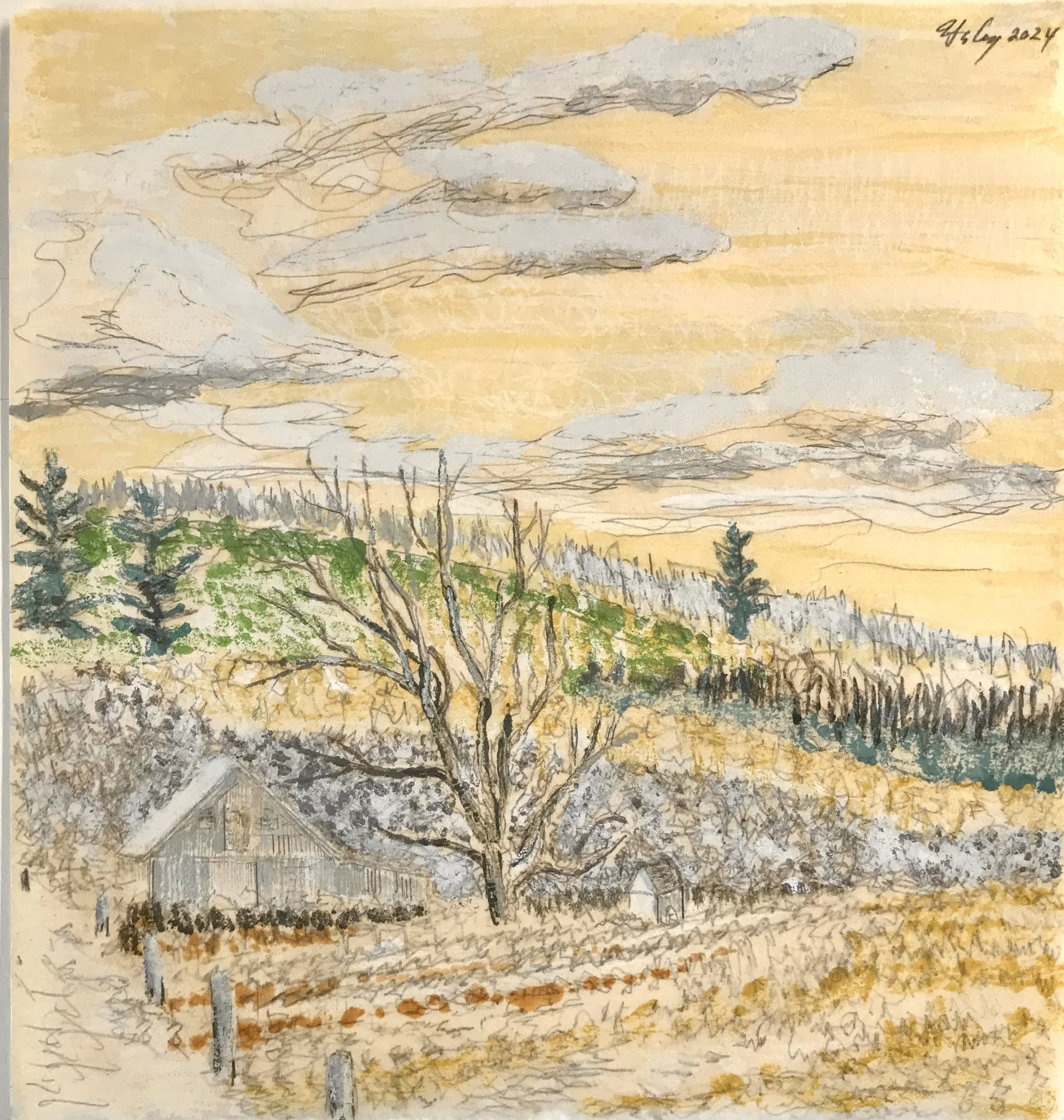 “Beech Hill Light” 2024 monoprint drawing on Kitakata paper 11x11”