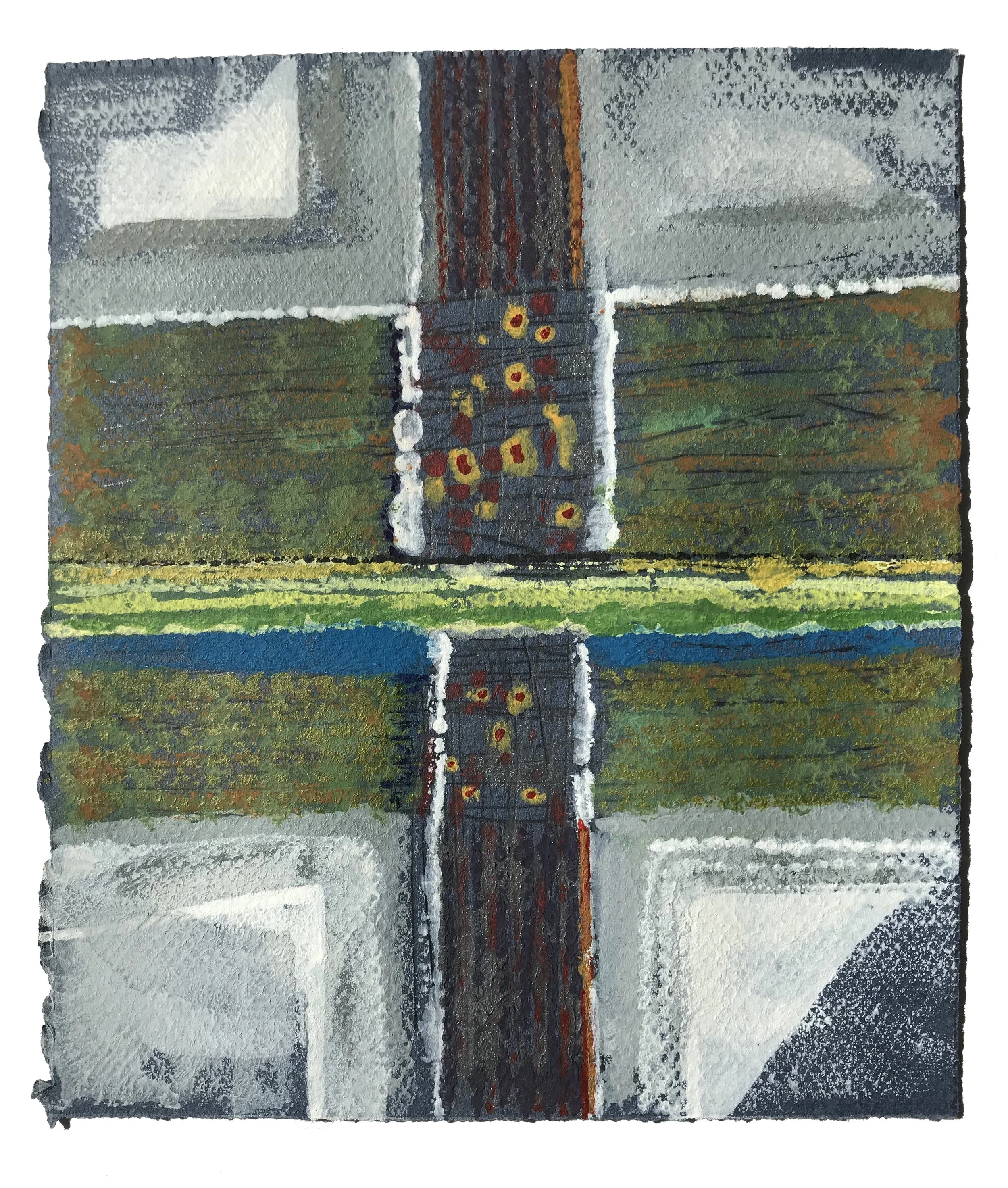 “Crossroads” 2018 monoprint drawing on grey Strathmore paper 12x9”