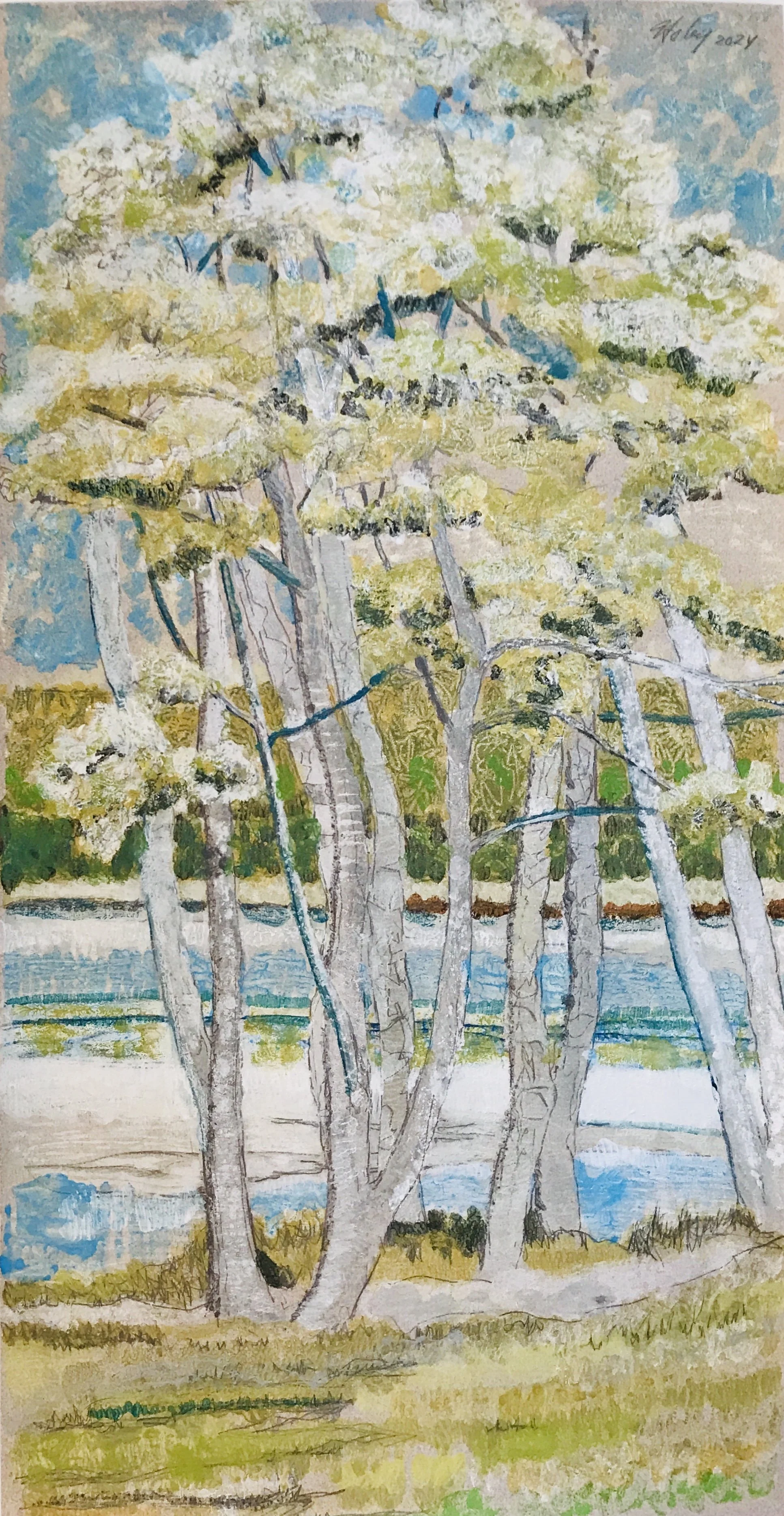 “Poplar Grove at Narragaugus Bay” 2024 monoprint drawing on grey Strathmore paper 23x12”