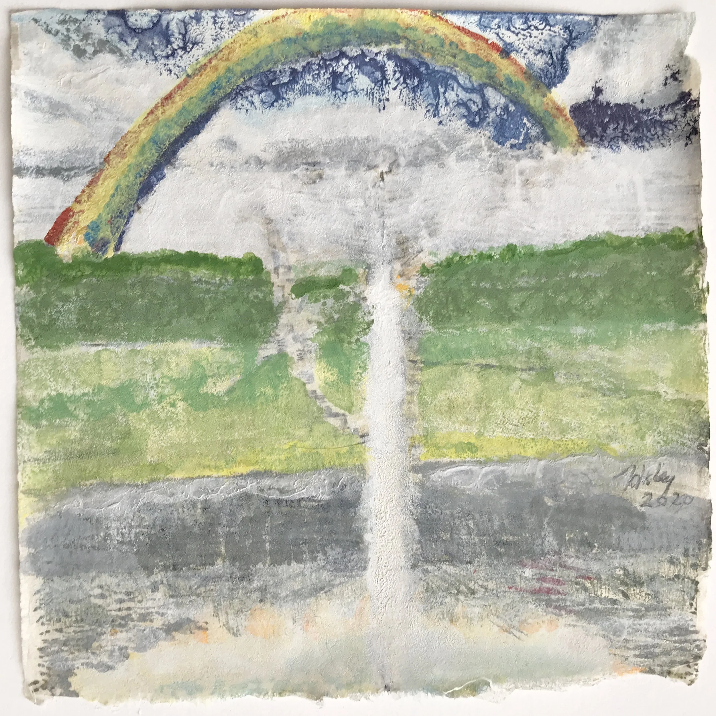 “Rainbow Falls” 2020 monoprint drawing on Kitakata paper 11x11”