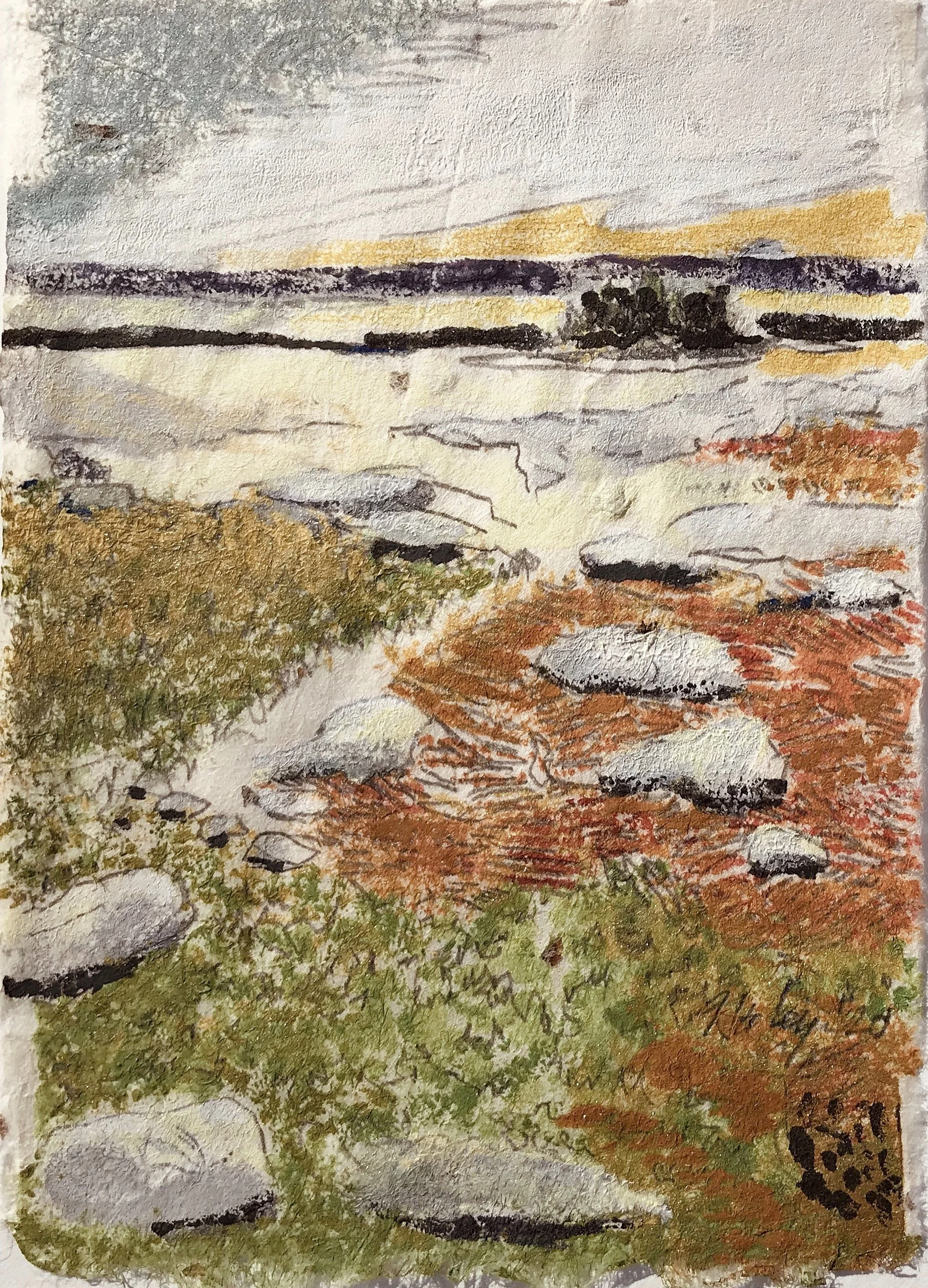 “Sunrise over Sunset” 2021 monoprint drawing on Kitakata paper 11x6”